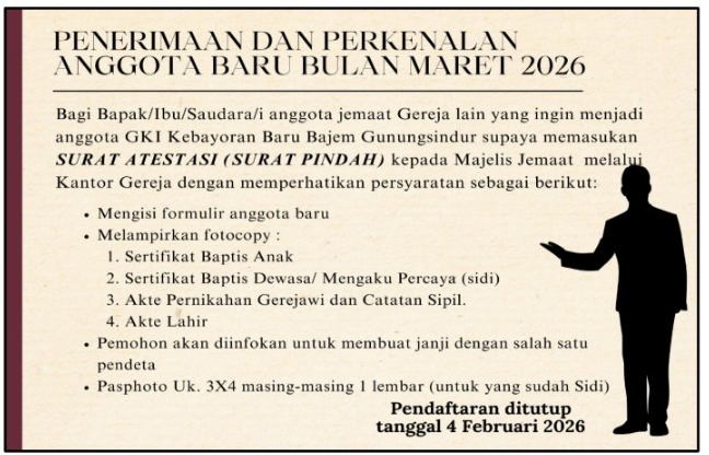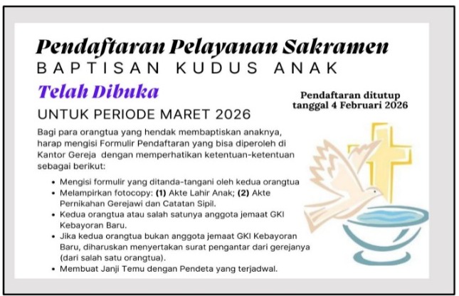 PENDAFTARAN PELAYANAN SAKRAMEN BAPTISAN KUDUS ANAK PERIODE MARET 2026